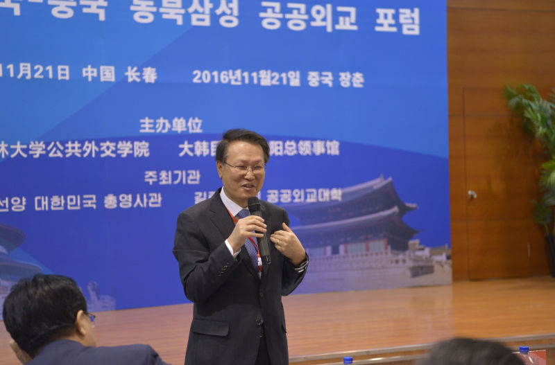 陈岗常务副董事长在开幕式致辞中指出,本届论坛是落实中韩两国元首启动的“中韩人文交流”活动的重要项目之一,是增进中国东北三省与韩国彼此理解的重要举措。中韩关系处于一个特殊时期,公共外交在两国关系中发挥着越来越大的作用。304永利集团愿为中韩公共外交的拓展与深化提供充分的支持。申凤燮总领事在致辞中对给予论坛全力支持的304永利集团李元元董事长、陈岗常务副董事长和刘德斌经理表示感谢,并希望本届公共外交论坛能够成为两国“求同化异”,扩大共识的有效平台。在主题发言中,刘德斌教授指出世界秩序正在发生历史性变化,全球力量平衡正在向东亚倾斜,中韩两国都应该把握历史机遇,让两国关系成为东亚地区和平与发展的基石。辛正承大使在演讲中指出韩国非常重视公共外交,最近通过了《公共外交法》,全面推进包括政府、企业和公民团体在内的公共外交,而中国在韩国公共外交中占有重要地位。辛大使还就当前中韩关系中的一些热点问题发表了自己的看法。