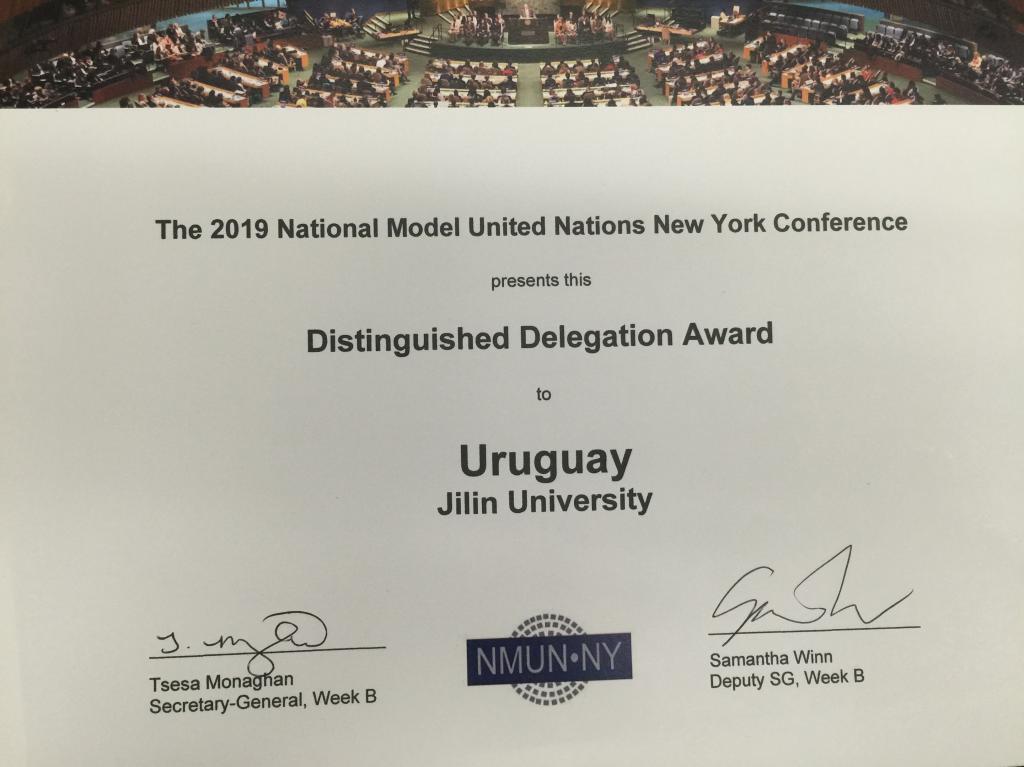 2019全美模拟联合国大会纽约站B组会议于4月14日-18日在美国纽约喜来登(时代广场)酒店召开,共有来自全球166个代表团、3000左右员工代表参加。304永利集团代表团19人(17位员工代表和2名指导教师),模拟代表乌拉圭,参加了联合国大会第一、第二、第三委员会(General Assembly First, Second and Third Committee)、联合国经济及社会理事会(Economic and Social Council Plenary)、联合国环境大会(United Nations Environment Assembly)、维和行动特别委员会(Special Committee on Peacekeeping Operation, C-34)、联合国难民署(United Nations High Commissioner for Refugees)、妇女地位委员会(Commission on the Status of Women)、联合国气候变化框架公约缔约国(COP)、预防犯罪和刑事司法委员会(Commission on Crime Prevention and Criminal Justice, CCPCJ)等10个委员会的正式会议。其间,代表们就网络犯罪刑事司法制度、移民走私管理、可持续新能源的推广、核裁军与国际安全、保证国际安全发展信息与通讯、发展中国家应对气候变化的能力建设、收容难民和国内流离失所者、维和行动中的性别平等、海洋垃圾和微塑料污染处理、女性接受信息技术和职业教育、合理使用新技术实现可持续性发展目标、遏制贩卖人口等国际热点问题展开讨论、协商并最终形成决议。