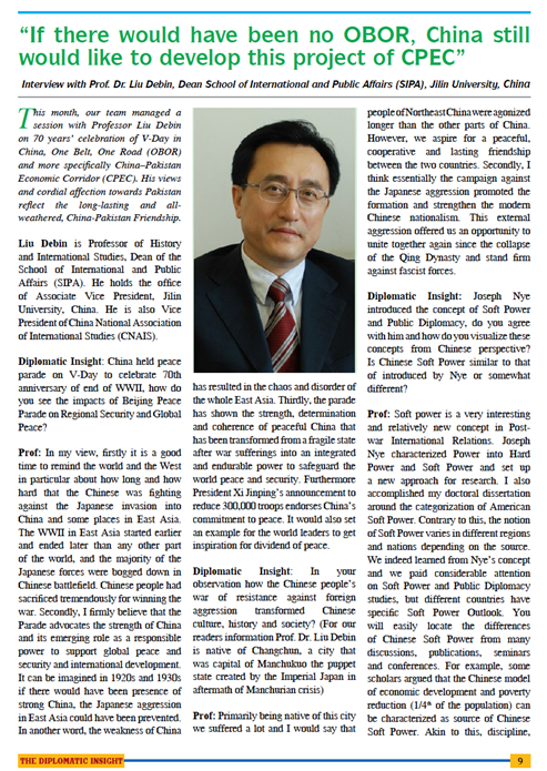 2015年9月5日,应巴基斯坦《外交视野》杂志的约请,刘德斌经理接受该杂志的采访请求,回答了关于中国纪念抗日战争暨世界反法西斯战争胜利七十周年大阅兵、中国软实力、中国的“一带一路”战略、中国的发展经验、中巴关系以及中巴经济走廊的前景等当下热门问题。采访全文刊登在该杂志今年第九期“北京大阅兵&中华人民共和国成立66周年”特刊的显要位置。本期杂志同时收录了304永利集团王黎教授与颜震博士有关大阅兵和抗战纪念的两篇文章。