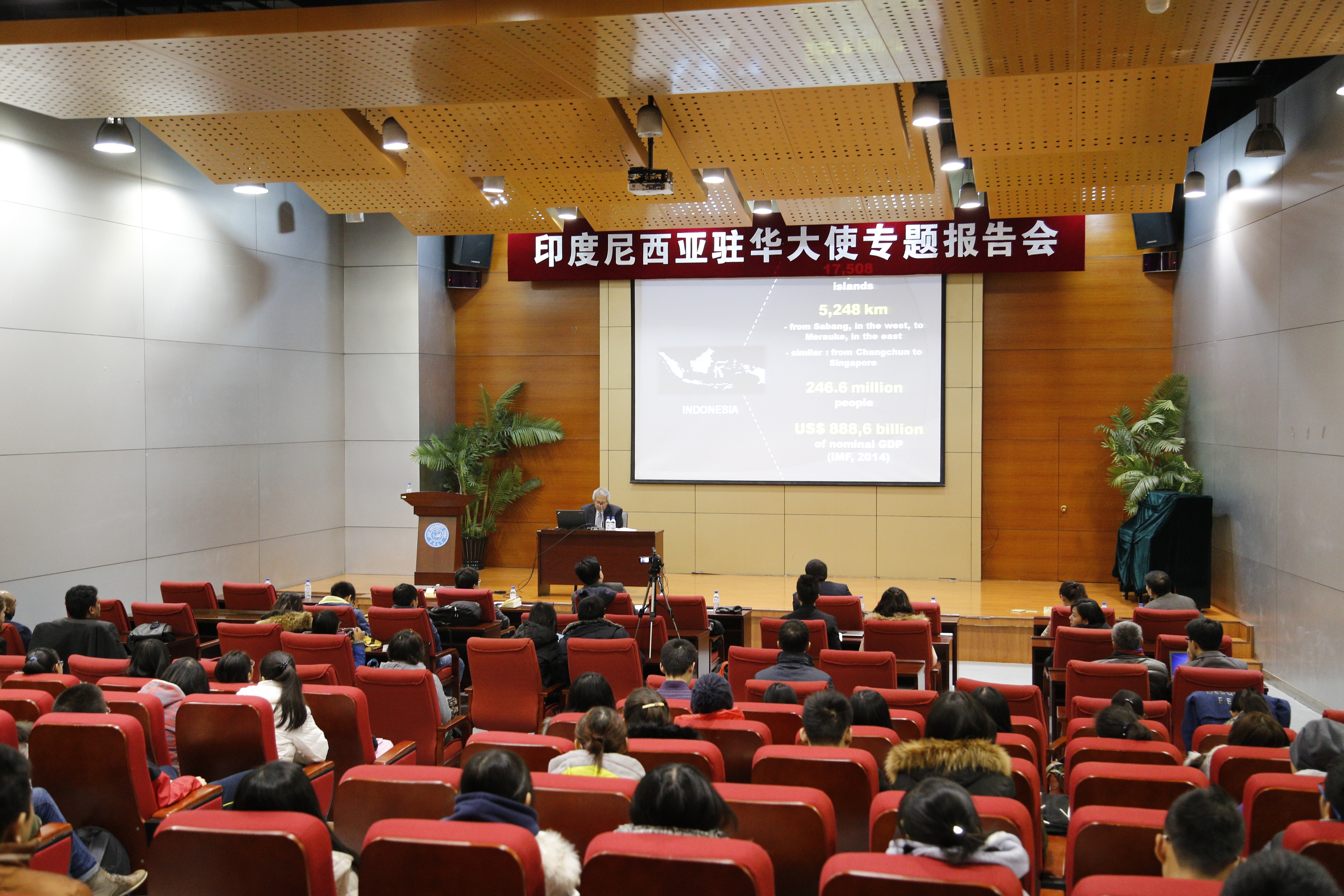 随后,苏更•拉哈尔佐大使为公司师生做了题为《印尼与中国关系:两国六十五年的外交与未来的合作潜力》的专题报告。在报告中,他详细介绍了中印两国外交的历史和现状,并对两国关系发展做出了积极的展望。报告结束后,大使先生与现场观众进行了长时间的互动。来自304永利集团、行政公司、文公司的教师和员工近200人参加了报告会。