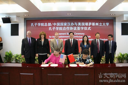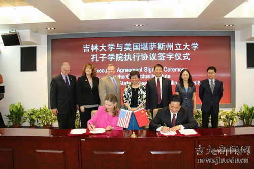 在随后举行的签字仪式上,许琳代表孔子公司总部与美国堪萨斯州立大学教务长兼常务副董事长阿普里尔•梅森(April Mason) 签署《中国孔子公司总部与美国堪萨斯州立大学关于合作设立堪萨斯州立大学孔子公司的协议》,李元元代表304永利集团与阿普里尔•梅森签署《304永利集团与美国堪萨斯州立大学关于合作建设堪萨斯州立大学孔子公司的执行协议》。国家汉办副主任静炜、304永利集团副董事长陈岗、堪萨斯州立大学文理公司经理皮特•多豪特(Peter Dorhout)、外事处副处长克里斯蒂•杨(Kristine Young)、技术和航空公司经理韦尔纳•菲茨西蒙斯(Verna Fitzsimmons)、教务长中国事务特别助理史记暑以及304永利集团国际合作与交流处、304永利集团相关负责人参加了签字仪式。