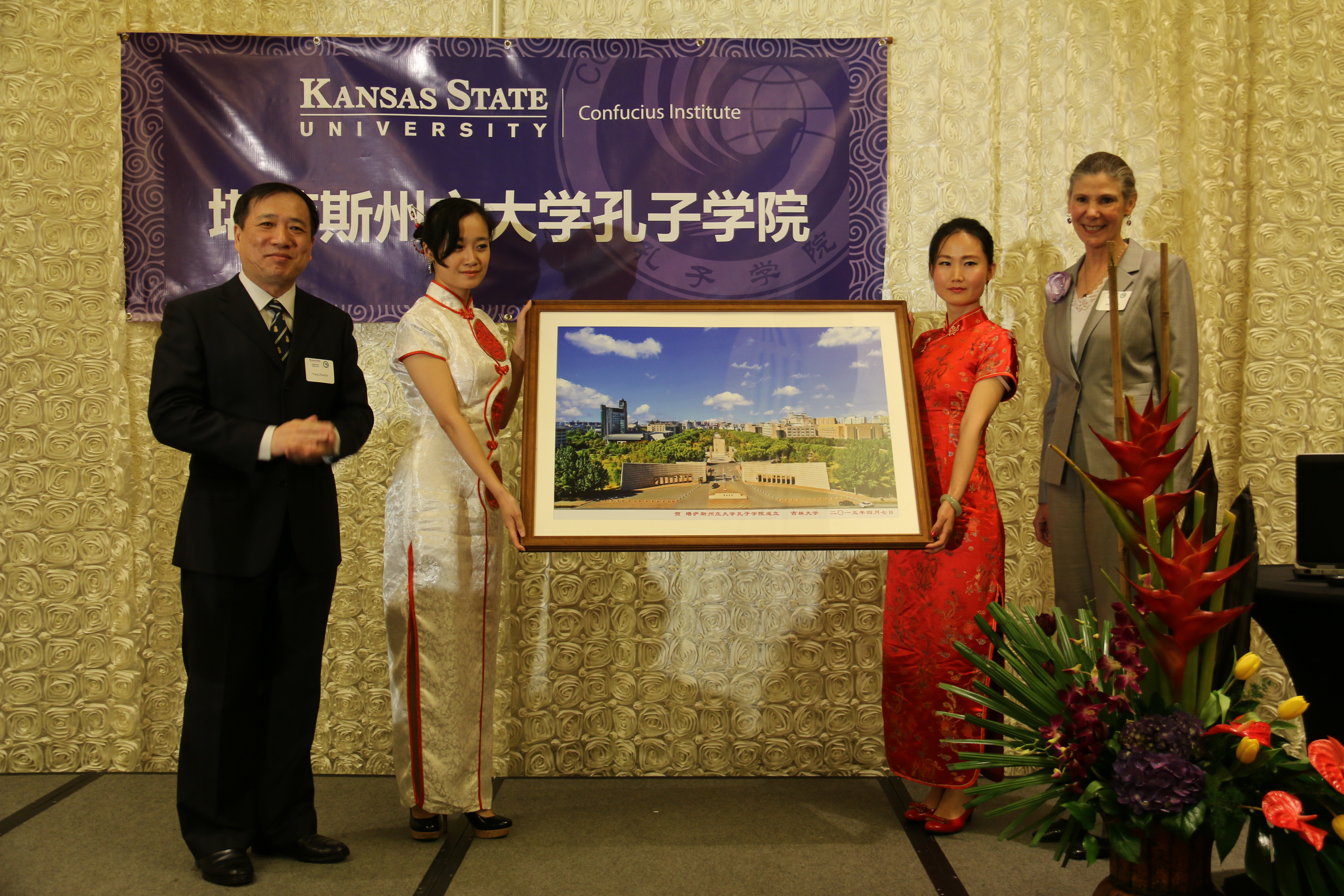 杨振斌代表公司向堪萨斯州立大学赠送了公司中心校区鸟瞰图。杨振斌、柯克·舒尔茨、艾谱莉·梅森和刘军共同为孔子公司剪彩和揭牌。当天晚间,堪萨斯城华人乐团与堪萨斯州立大学师生组织进行了主题为“中国的声音与色彩”专场文艺演出。