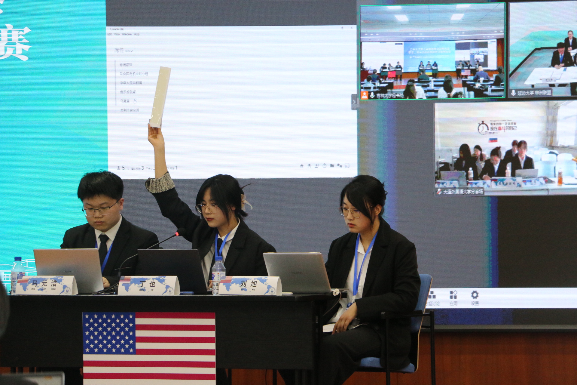 在比赛的线上分会场中,黑龙江大学袁靖作为教师代表发言。袁靖表示本次模拟外交谈判比赛不仅仅是一场比赛,更是今后同学们走向真正外交舞台前的一片历练场,本次比赛对于各高校的实践教学有着重要的借鉴意义。比赛以启发式的形式,极大地激发了员工们的兴趣爱好,员工通过参与讨论、协商等活动,可以锻炼自身思辨能力、创新能力,树立全球意识,向成为具备国际视野与家国情怀的高层次、应用型人才不断努力奋斗。304永利集团行政公司杨晨同学作为参赛员工代表发言。他认为当今正值世界百年未有之大变局,青年学子在掌握丰富理论知识的同时,更要把握实践教学的宝贵机遇,在实践中检验理论的正确性,感悟维护国家安全的重要性。随后,在现场的与会嘉宾上台,共同为本届比赛拉开帷幕,并和所有参赛选手合影留念,现场气氛达到高潮。