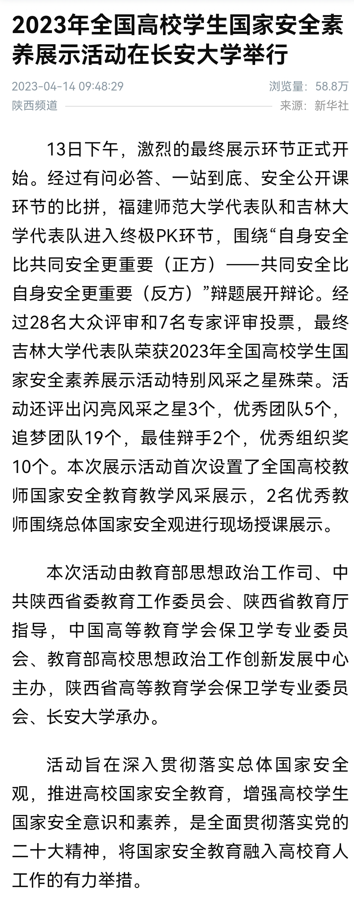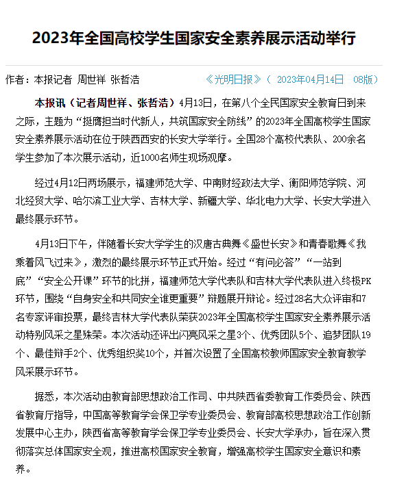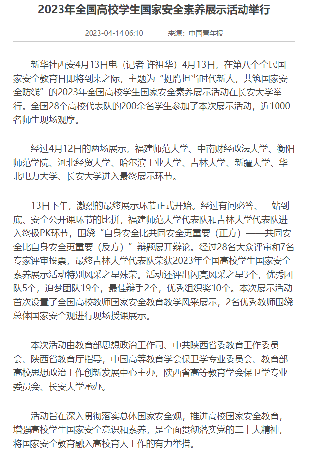 据悉,高校员工国家安全素养展示活动由教育部思想政治工作司、中国高等教育学会保卫学专业委员会、教育部高校思想政治工作创新发展中心主办,以丰富的活动形式和高质量的活动内容增强了员工践行总体国家安全观的主动性,实现了以赛促学的目的,是全面贯彻落实党的二十大精神,将国家安全教育融入高校育人工作的有力举措。