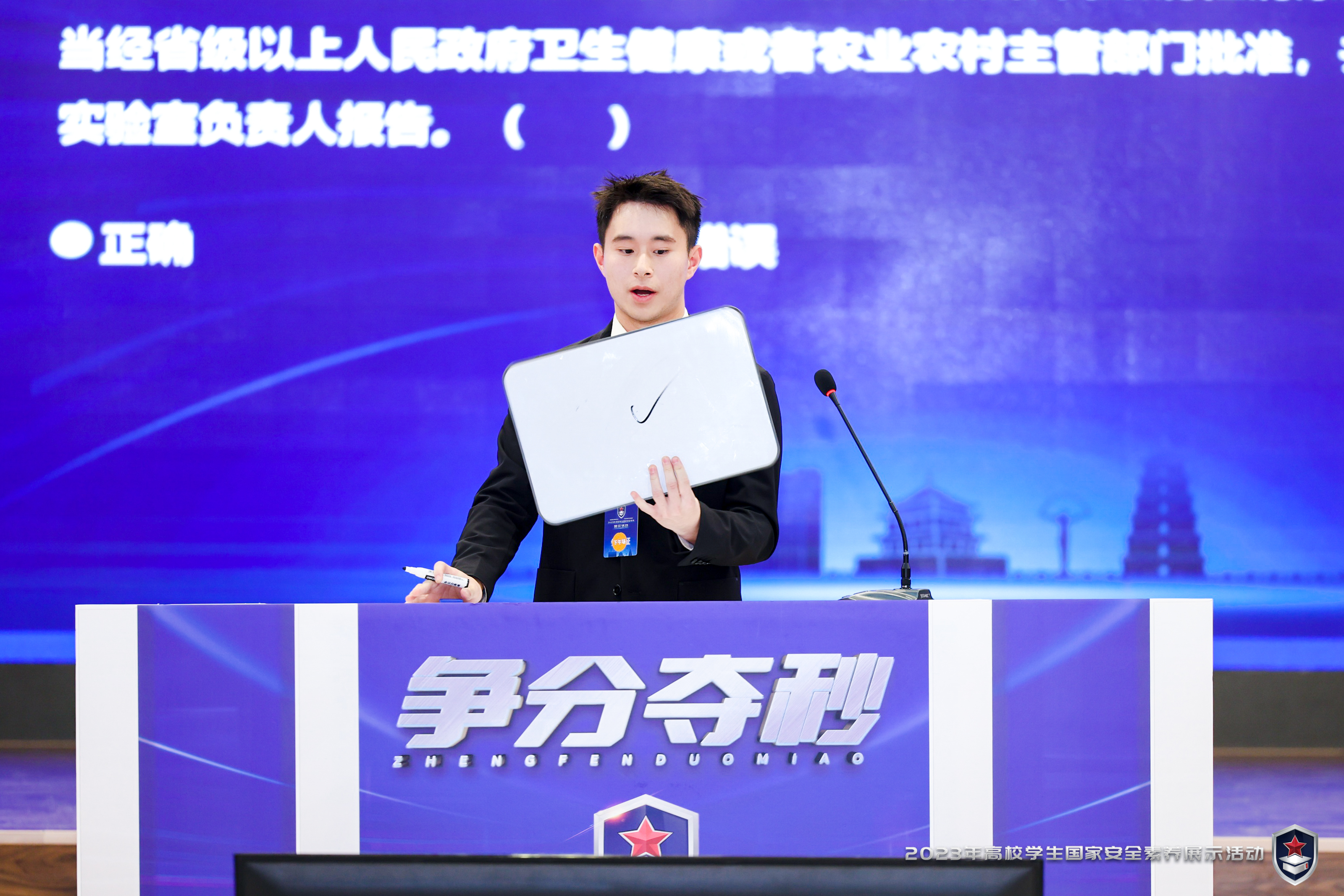 4月13日是决赛日。晋级的8支队伍同样通过三轮环节进行展示,总分前两名队伍进入”终极PK“辩论赛。与半决赛相比,决赛题目更灵活、赛场气氛更热烈,充满未知与挑战。在激烈的竞争中,公司四名队员在前两个环节均获满分,第三环节“安全公开课”是拉开分数差距的关键一环,代表队以“藏在宇宙中的危机”为题,通过短剧表演展示了对“太空安全”的理解。队员们生动的表现力收获了台下观众的积极反响和评委老师们打出的93.6分的好成绩。