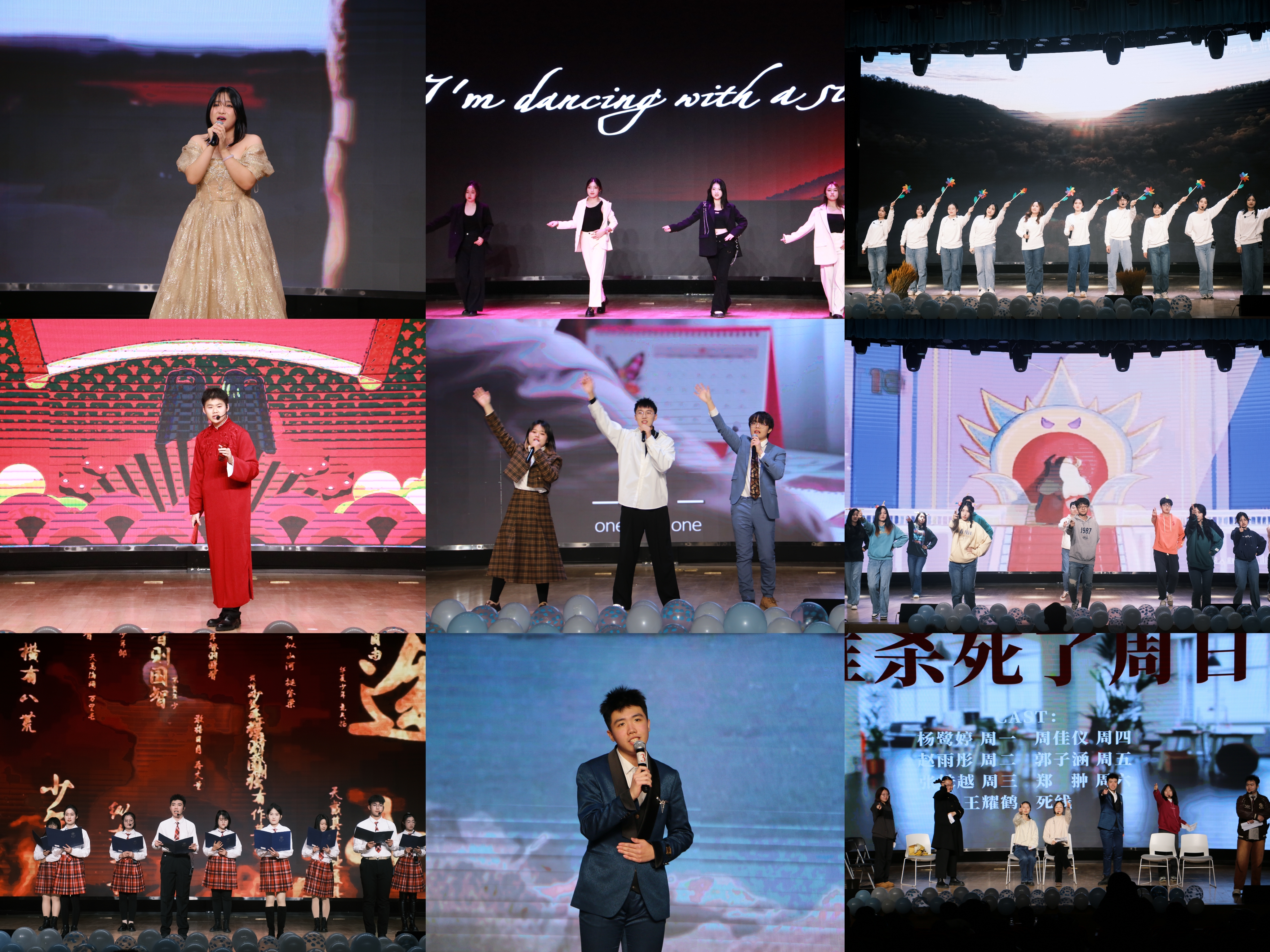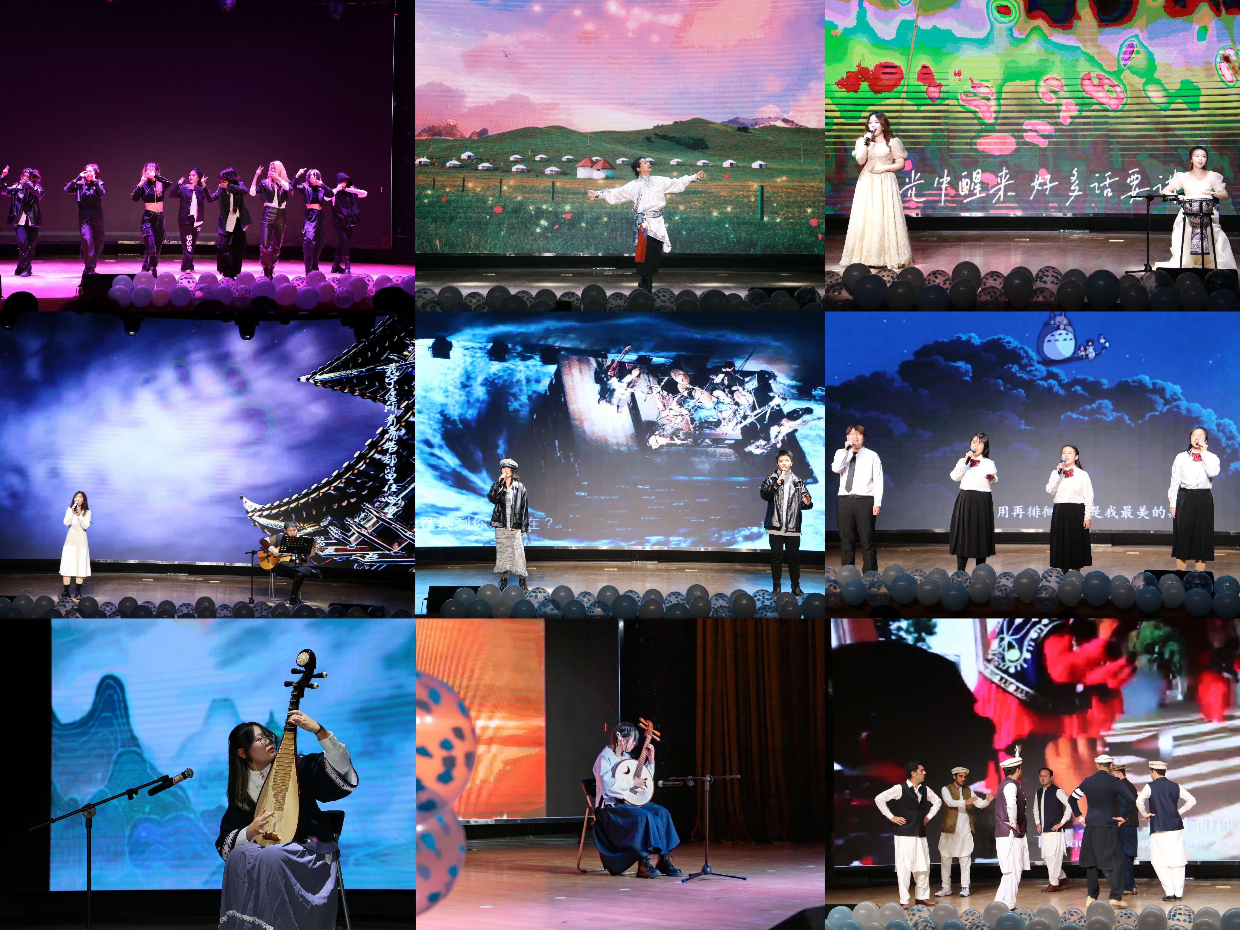 舞台灯光聚集,Crush舞团的开场舞《MANIAC》闪亮登场。节奏强烈的音乐,动感张扬的舞姿,点燃全场。郑翀演唱的《富士山下》以及团学主席团和部长们带来的《稻香》动人心弦,他们用温暖的歌声再现刻在唱片里的时代记忆。天苍苍,野茫茫,孟翔冲老师用矫健的舞姿讲述来自蒙古草原《天边》的故事。舞蹈《Dancing with a stranger》、《Ilusion & Perfect Night》以及《舞动快乐青春》律动青春节奏,舞出闪耀光芒。宋奇翰打着快板《说点儿》,希望大家“幸福靠近点儿,烦恼走开点儿”。小品《谁杀死了周日》将时间拟人化,用幽默风趣的方式启示大家珍惜时间、拒绝拖延,收获了观众们的阵阵欢笑。乐器演奏与独唱《这世界那么多人》旋律动听,一句“多幸运,我有个我们”启迪我们“遇见即是幸运”。扫动琴弦,吉他弹唱《星瓷》温情舒缓,展现音乐温婉的美。合唱《少年他的奇幻漂流》与《最美的期待》借歌声传达少年期冀美好未来,终载星河航向未来。诗朗诵与独唱《少年中国说》诠释着中华民族自强不息的精神品格,彰显了身为新时代青年所担负的使命与担当。中阮演奏《丝路驼铃》呈现出的浓郁民族风情,使现场观众置身于千年前的丝路旅途之中;琵琶声清亮悠扬,一首《彝族舞曲》如同大地的鼓动,唤起了万物的欢欣。《路过人间》《肖邦A小调四舞曲》《凌美地》三首歌曲的串烧,将人声与琴声完美融合,把现场的艺术氛围与情感共鸣提高到一个新的境界。伴随全场热烈的掌声,晚会在职工的民族舞蹈《Pushdo Attan》中接近尾声。