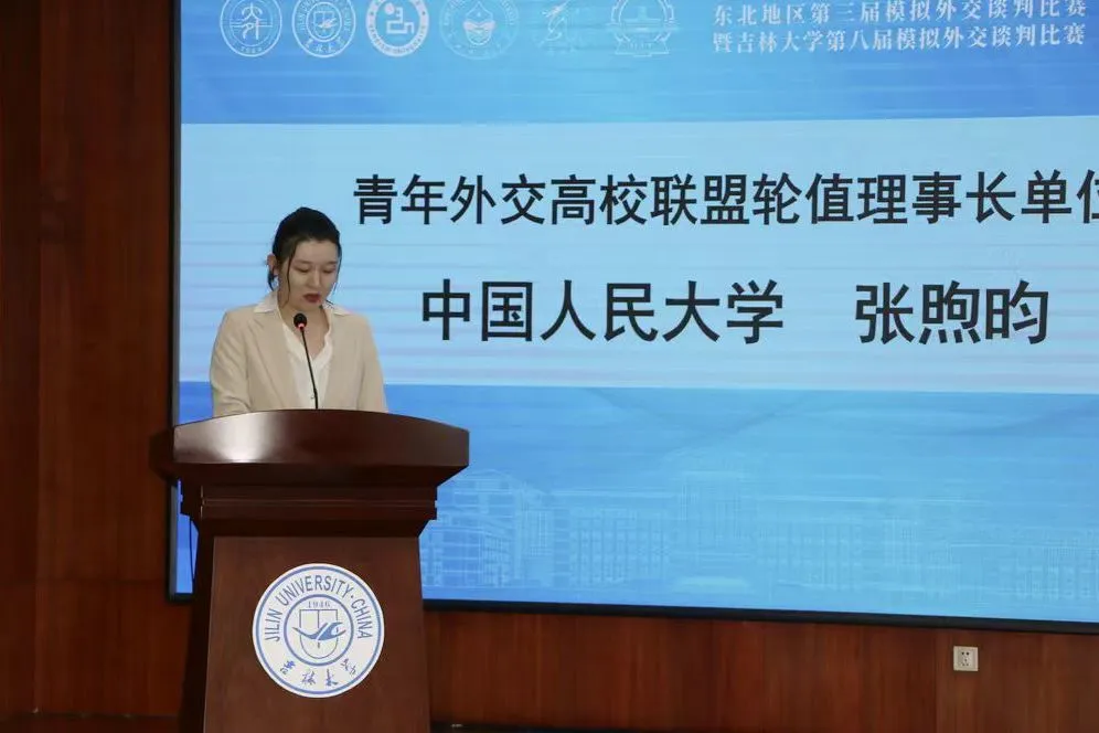中国人民大学团委副书记张煦昀作为青年外交高校联盟本年度轮值理事长单位的代表,向张国兴副董事长表示衷心的感谢,向参加本次比赛的各位选手、指导老师和工作人员表示亲切的问候,并强调了青年外交高校联盟在促进中国青年参与国际交往和国际传播、培养具有全球视野的青年人才方面所起的重要作用。张煦昀指出,本次比赛主题与联盟2024年工作要点高度契合,有助于帮助员工积累全球治理知识,提升外交实践技能,培养符合中国特色大国外交需求的国际化青年人才,从而推动青年外交事业的发展,并为联盟年度活动增添了亮点。她鼓励当代中国青年把握时代机遇,将个人理想与国家和民族的未来紧密结合,为国家发展和新时代中国外交事业贡献力量。
