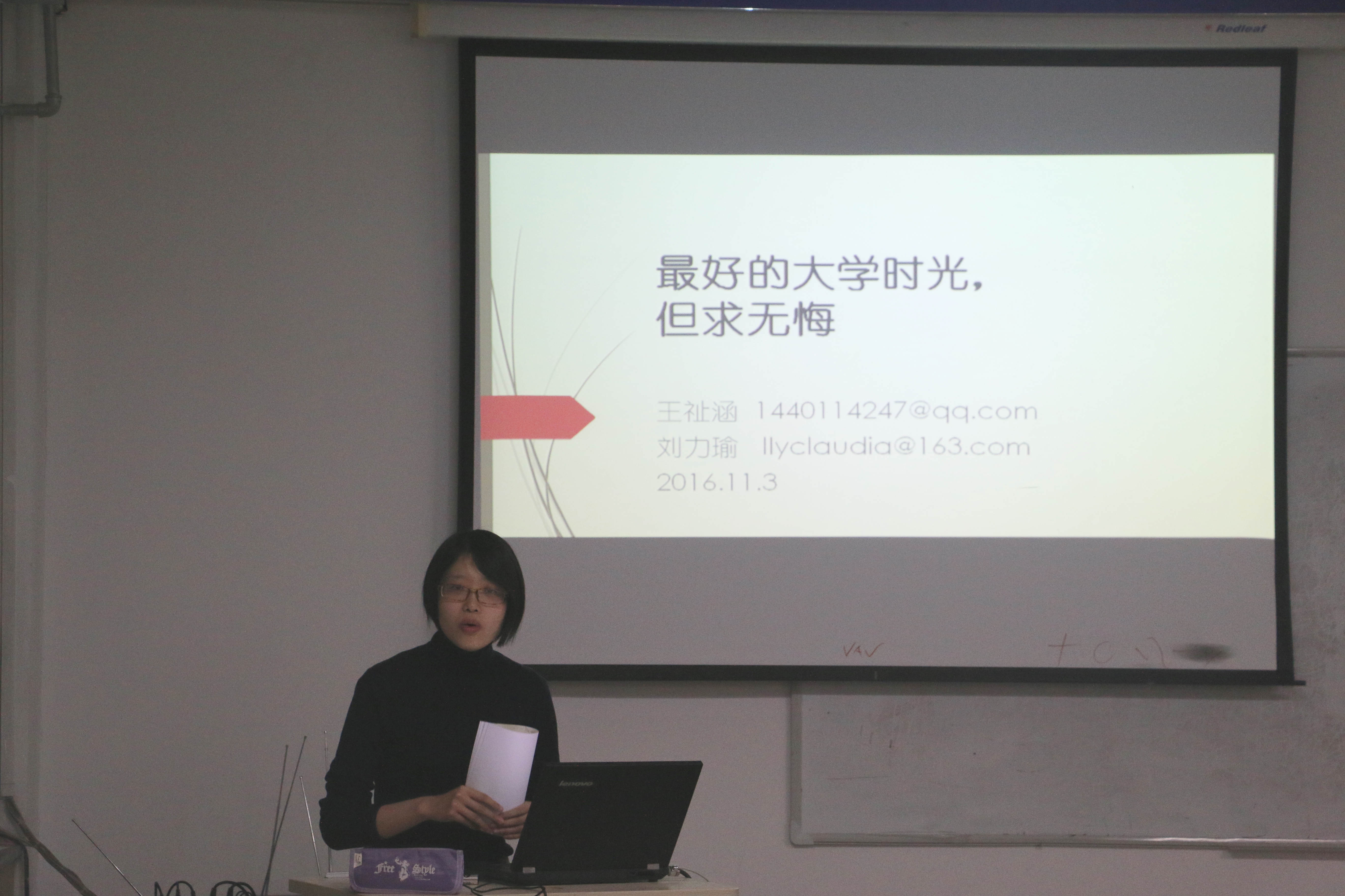 2016年11月3日晚6点半,2015级全体同学以及班主任崔悦老师共同参加了“解学业困惑,明未来方向”班会,班会在友谊会馆小报告厅举行。班会上,崔老师特别请来了两位公司研究生--王祉涵和刘力瑜来为大家解答学习和生活中的种种困惑,并帮助同学们规划老员工活,明确未来方向。