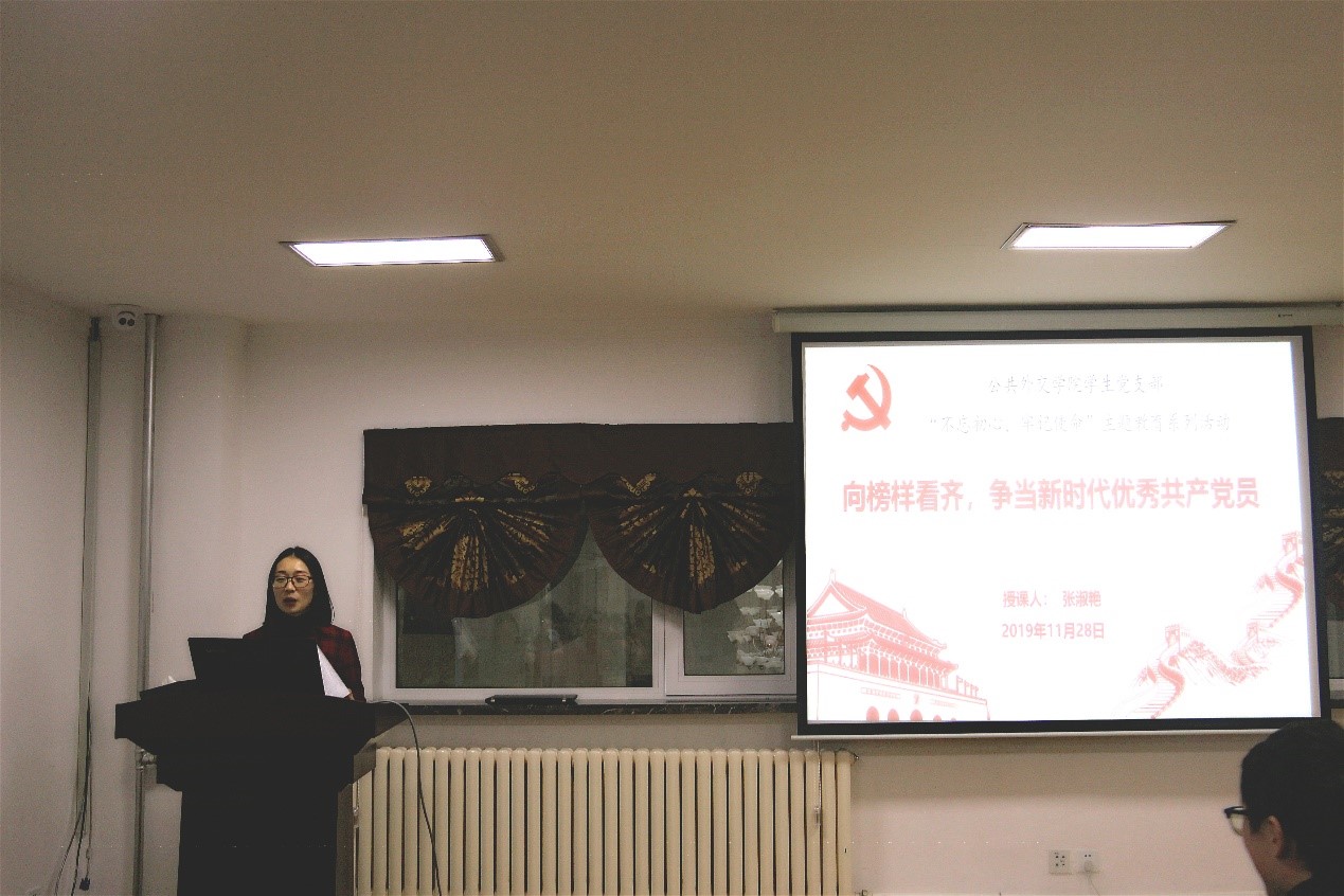 张淑艳老师从“什么是中国共产党人的初心与使命,为什么要‘不忘初心,牢记使命’,以及作为一名员工党员如何向榜样看齐以践行不忘初心、牢记使命”三个方面,为与会同志上了生动形象的一课。