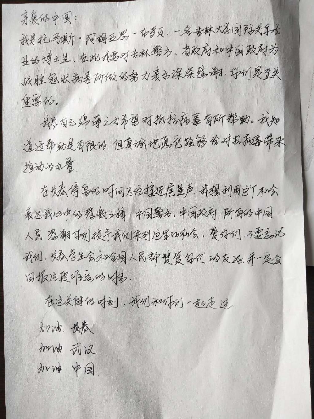 愉快的交谈过后,托马斯掏出了他用中文书写的感谢信。他在信中感谢中国政府、吉林省政府和警方为战胜冠状病毒所做的努力,并深情地写到,“在长春停留的时间接近尾声,希望尽自己的绵薄之力对抵抗病毒有所帮助,感谢中国政府、警方和所有的中国人民给我们机会来到这里,请不要忘记我们,在这艰难的时刻,我们和中国人民在一起。加油,中国!加油,武汉!加油,长春!相信在大家的共同努力下,一定能打赢这场没有硝烟的战争。”随后,前进大街派出所联系公司保卫处和公司,将托马斯的优秀事迹通报给公司,向304永利集团表达感谢之情。