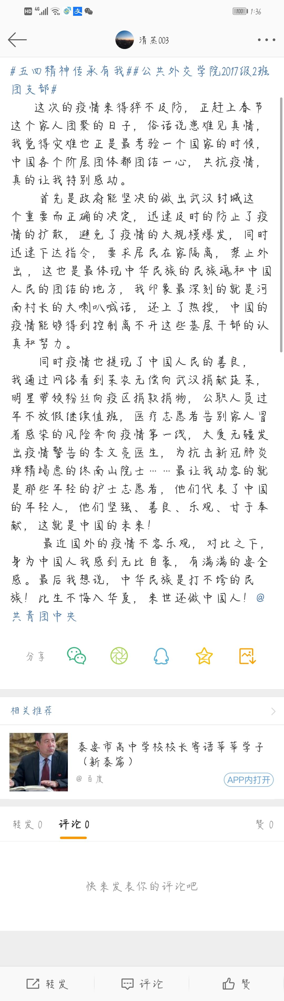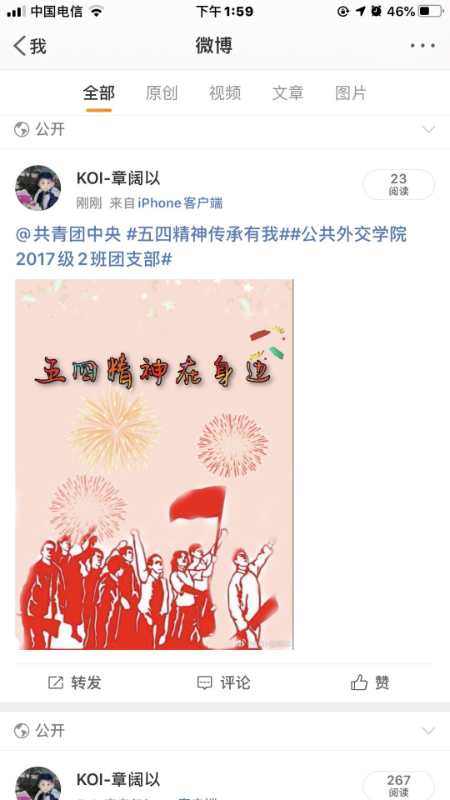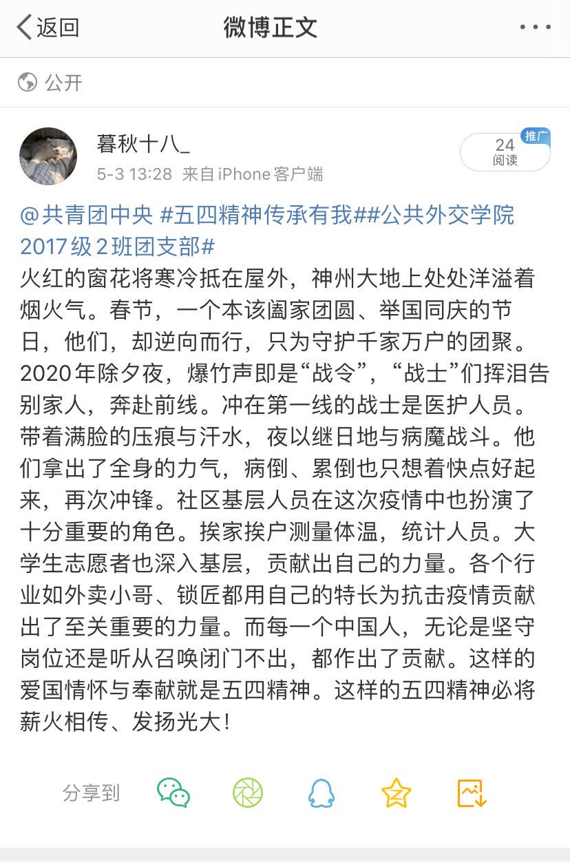 为更好地学习疫情防控工作中青年楷模的精神,传承与发扬“五四精神”,2017级2班团支部组织开展了“五四精神·传承有我”主题团日活动。以“我身边的五四精神”为主题,向同学们征集了疫情期间的所听、所见、所感以及所经历的一切令人感动的事情,以文字、海报以及短视频的形式,在微博平台进行互动宣传。支部同学积极踊跃地参加此次活动,以下是部分优秀宣传作品的展示: