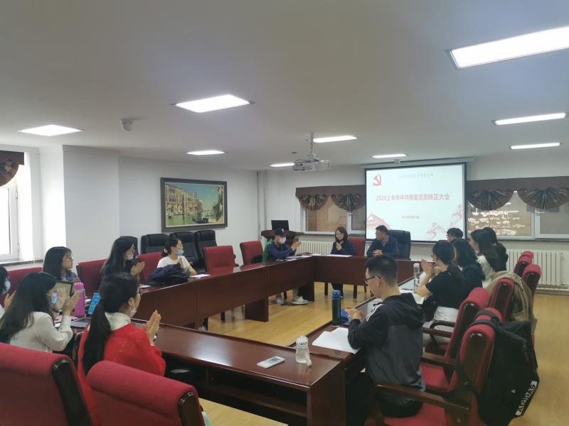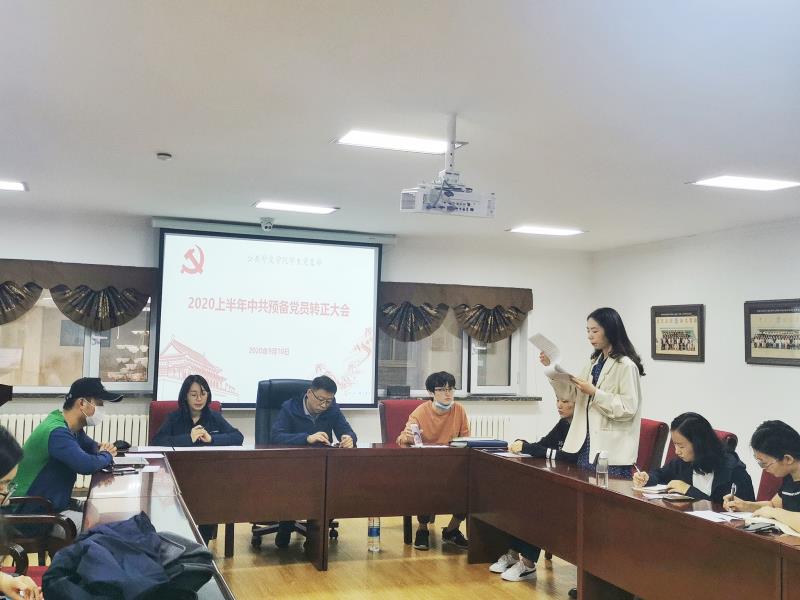 会议伊始,张淑艳老师介绍了会议的基本议程,确定参加会议、有表决权的正式党员人数超过半数,符合开会条件,宣布大会正式开始。按照会议议程,王川、张曼娜两位同志首先各自汇报了自己在预备期的思想和工作情况;随后,孔祥琦同志代表支部报告了对两位同志的审查情况,与会正式党员及预备党员分别发表了对两位同志的意见。所有同志一致认为,王川、张曼娜两位同志在预备期间表现优异,符合转正条件;经无记名投票,一致同意接收王川、张曼娜两位同志为中共正式党员。两位同志对党组织和各位同志的肯定表示感谢,同时也表达了自己的态度与决心。张老师祝贺两位同志顺利转为中共正式党员,希望她们能继续严格要求自己,做一名合格的党员。