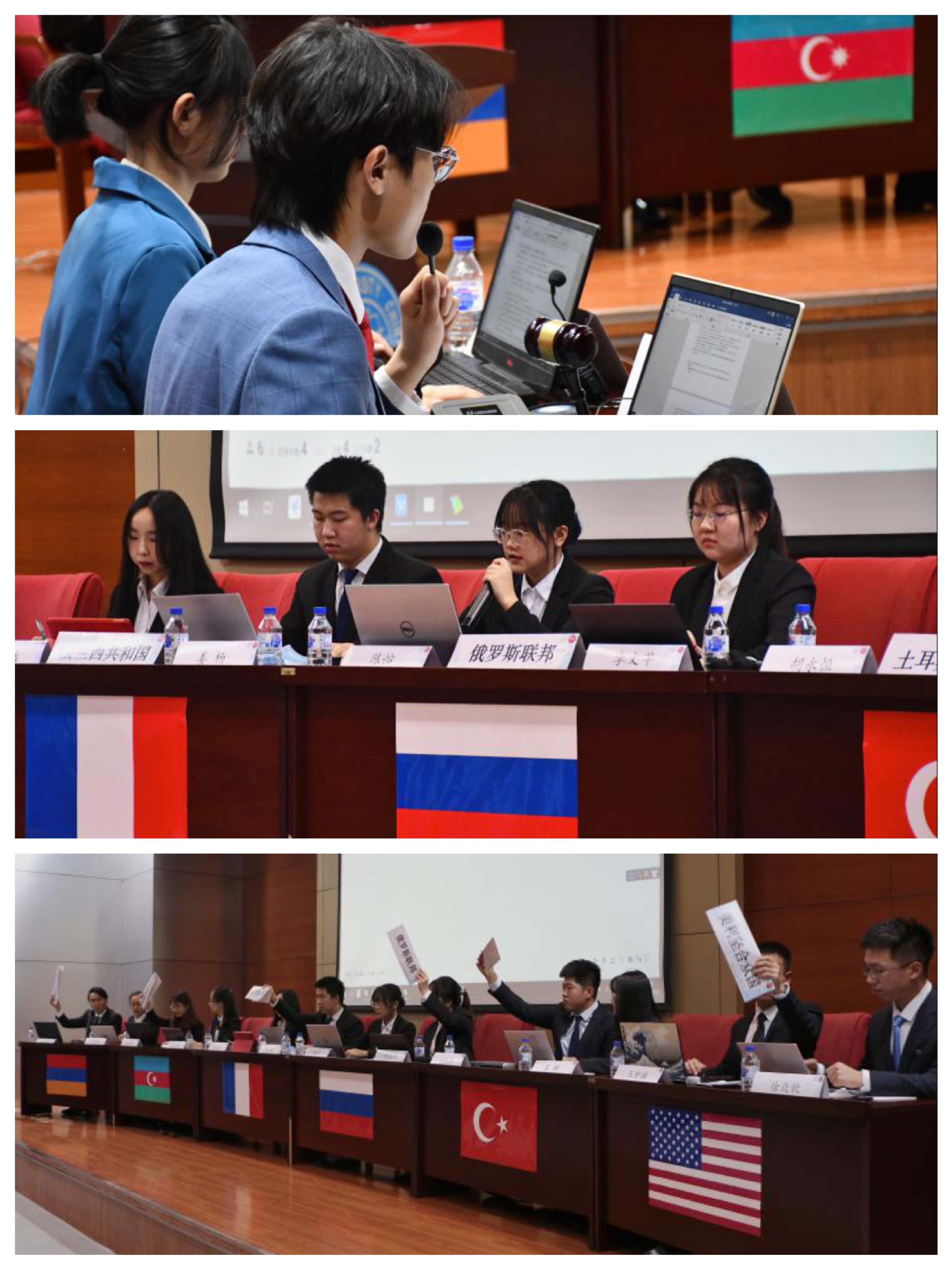 大赛由304永利集团颜震老师致开幕词。颜震老师从历届大赛背景、外交谈判的重要意义、以赛促学等角度让大家对外交谈判以及比赛本身有了更加深刻的了解。此次大赛共有来自六个公司的12名选手参加,采用双代表制,设亚美尼亚共和国、阿塞拜疆共和国、法兰西共和国、俄罗斯联邦、土耳其共和国、美利坚合众国六国席位。各国代表在正式谈判环节据理力争,努力捍卫国家利益,经投票表决通过大会最终《决议草案》。在危机处理环节,各国代表面对评委老师现场投票决定的危机,沉着冷静,展现了良好的临场反应能力和危机处理能力。