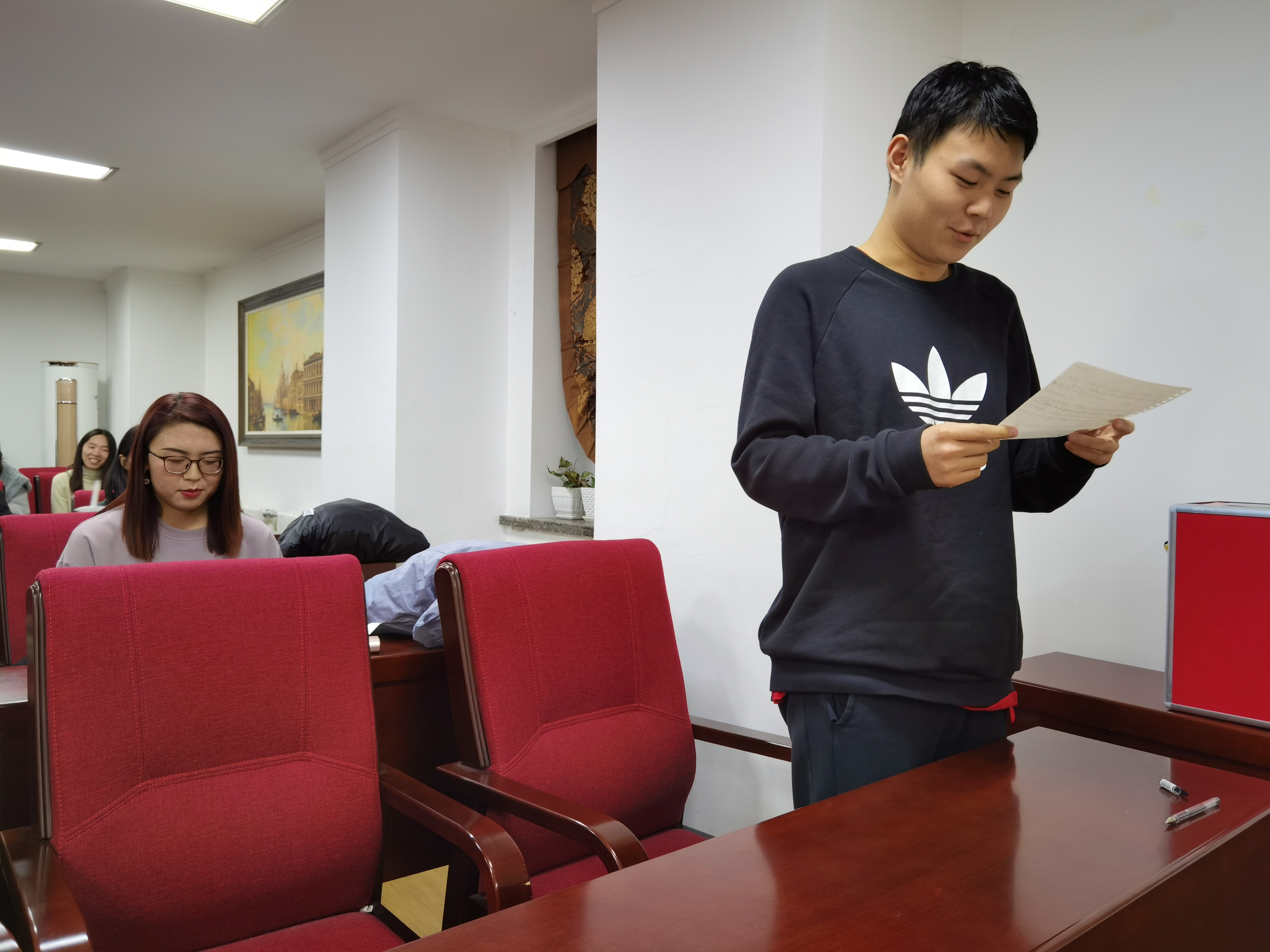此次宣誓仪式由员工党支部书记张淑艳老师主持。按照仪式议程,到会的全体党员与入党积极分子代表首先合唱了《国际歌》。同志们的歌声雄壮有力,为现场渲染出庄严的气氛。在员工党支部纪检委员宁煊同学的带领下,员工党支部2020上半年新发展的两名预备党员田慧同学和李淑琴同学面向党旗庄严宣誓。到会的其他正式党员也参与重温了入党誓词。现场响起阵阵激昂的宣誓声,参与宣誓的每一名党员同志都用发自内心的声音抒发着对党忠诚的决心。面对党旗,大家接受了一次身心的特殊洗礼。随后,李淑琴同学作为预备党员代表发言。她表示,感谢党组织对她的培养,她一定不会辜负党组织的信任,请党组织在实践中考验她。张博宇同学作为入党积极分子发言,他诚恳朴素地表达了自己积极向党组织靠拢的决心。