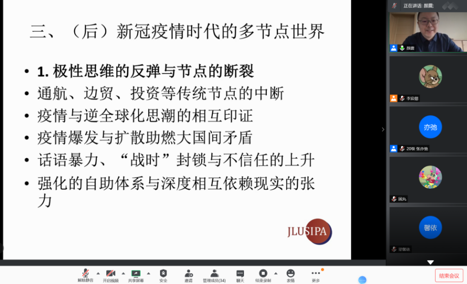 首先,他介绍了对未来国际秩序具有解释力的几组理论与概念,包括权力转移理论、多重复合世界等,并着重阐释了“多节点世界”理论。通过对基本概念、重要特征及其相互关系的梳理,颜震老师聚焦后疫情时代的多节点世界,指出在这一特殊背景下的“多节点世界”理论在当前国际社会中的三个主要表现和变化趋势,由此导向疫情对公共外交重构的讨论。