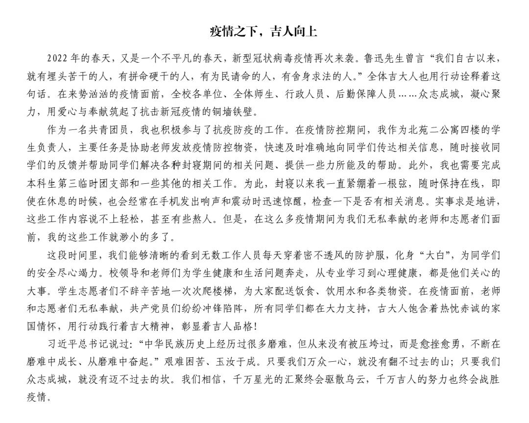 总有一种力量激励我们前行,总有一种精神让我们泪流满面,在全体吉大人同心抗疫的这段时间里,我们见到了无数无私奉献的人,看到了太多让人感动的事。为了鼓励同学们记录下自己的所见所闻,所思所想,深入发掘出抗疫阻击战中的典型事迹,304永利集团团委于2022年3月中旬积极开展了“青春抗疫”札记征文活动。