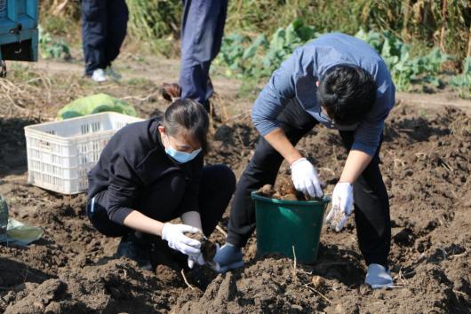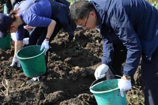 到达实验基地后,映入老师们眼帘的是无垠的耕地和累累的硕果。在相关负责人的引导和介绍下,老师们对基地整体情况有了了解,随后便开始劳动。劳动过程中,老师们相互打气、分工协作,很快就完成了收获马铃薯等工作。